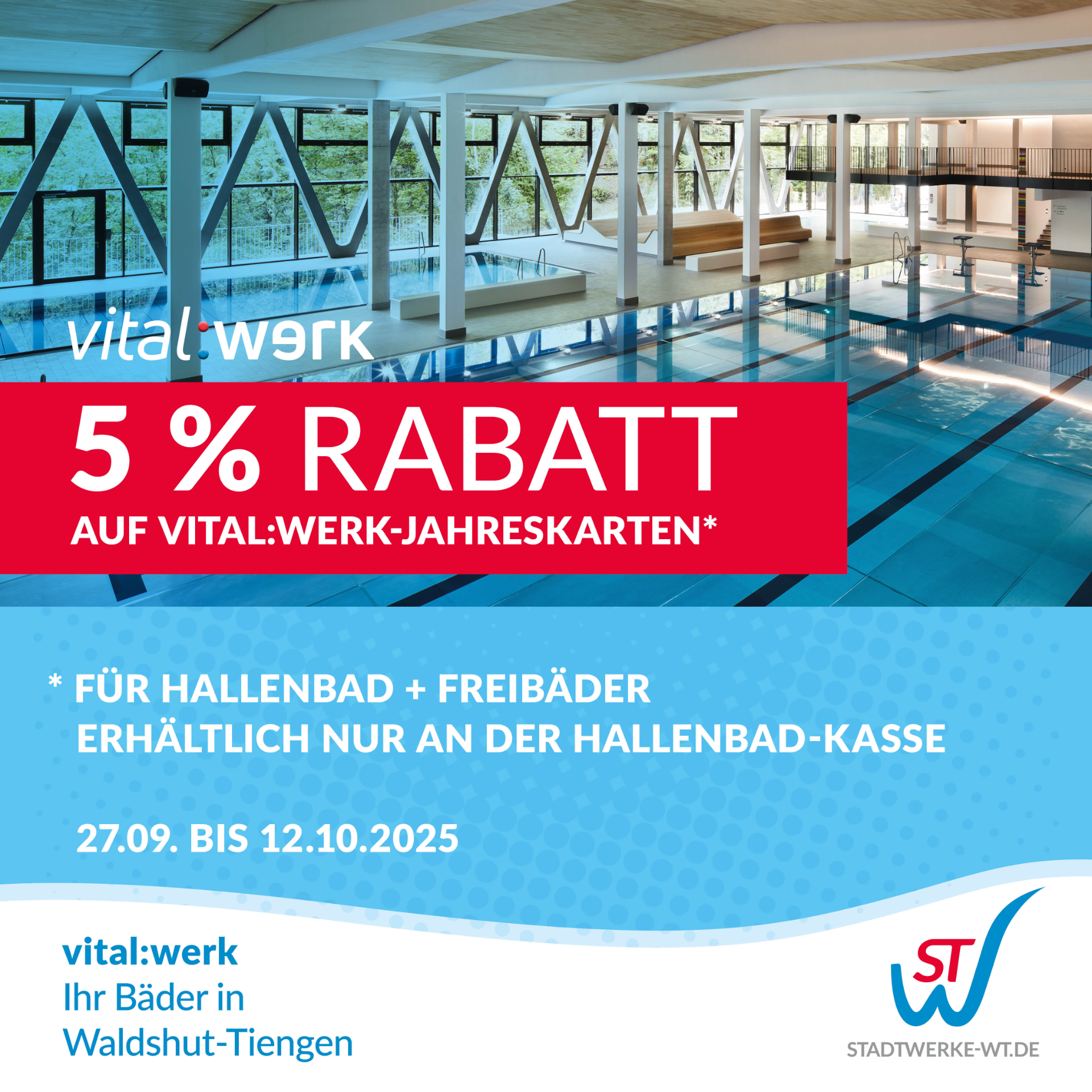 Aufgrund einer technischen Störung muss das Hallenbad heute, 30.10.2024, leider geschlossen bleiben. Die Sauna ist regulär geöffnet. Wir danken für Ihr Verständnis und geben hier bekannt, wenn das Hallenbad wieder geöffnet werden kann.